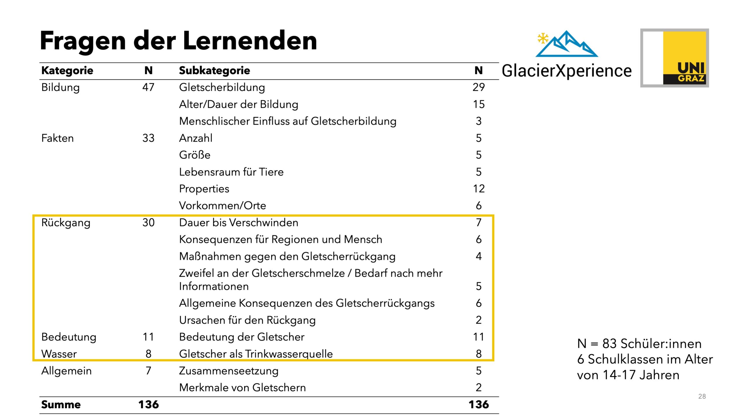 Dabei zeigte sich, dass das vorhandene Wissen über Gletscher meist sehr grundlegendes Basiswissen war – etwa dass Gletscher aus Eis bestehen, kalt sind oder sich in den Alpen befinden. Teilweise traten auch Fehlvorstellungen auf, wie die Gleichsetzung von Gletschern mit Eisbergen oder die Annahme, dass Gletscher Lebensräume für Tiere seien.